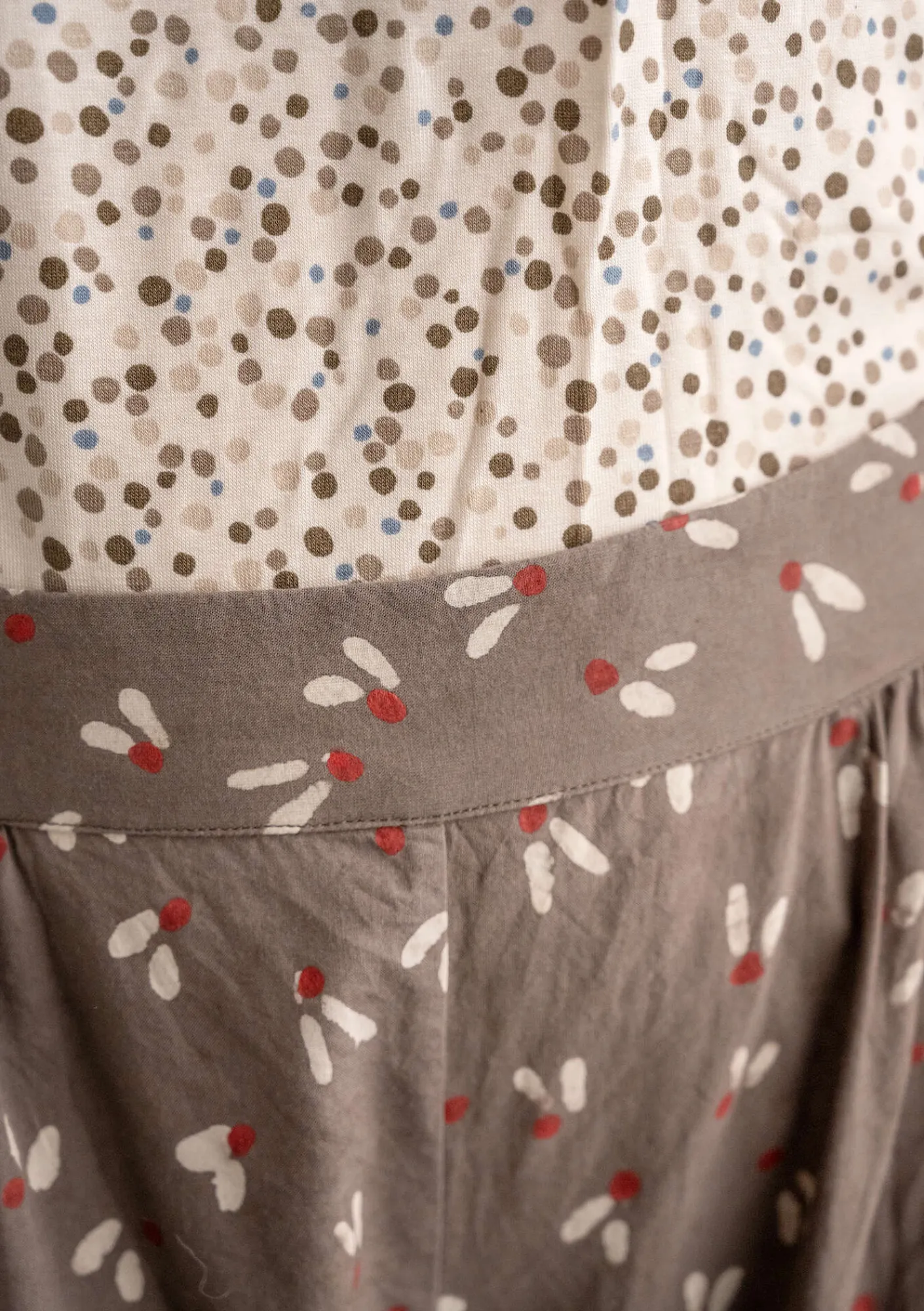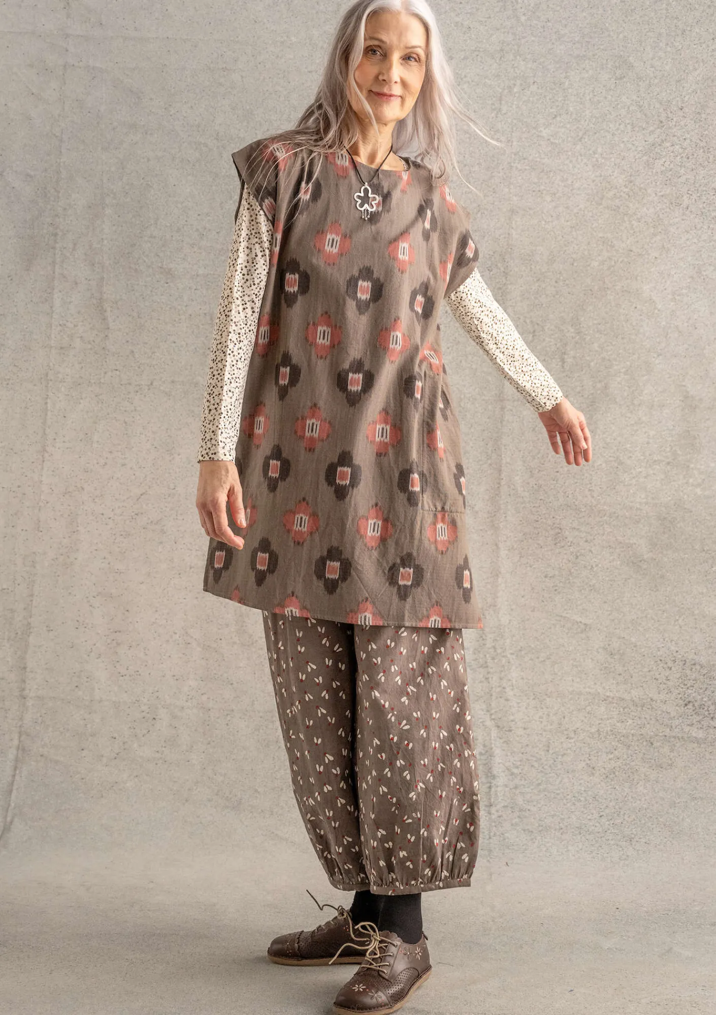 Småmönstrad puffbyxa som blocktryckts med lera och doppats i olika färgbad med växtpigment. Modell med insydd resår midjan och praktiska sidfickor.