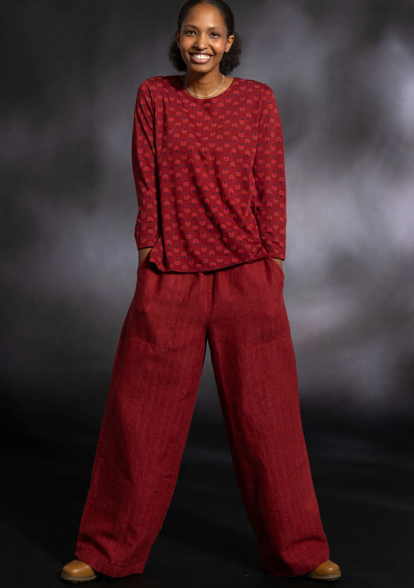 Hellång byxa i fiskbensvävt tyg. Modell med bekväm resår i midjan och vidd i benen. Utanpåfickor fram. Sydd av resttyg.