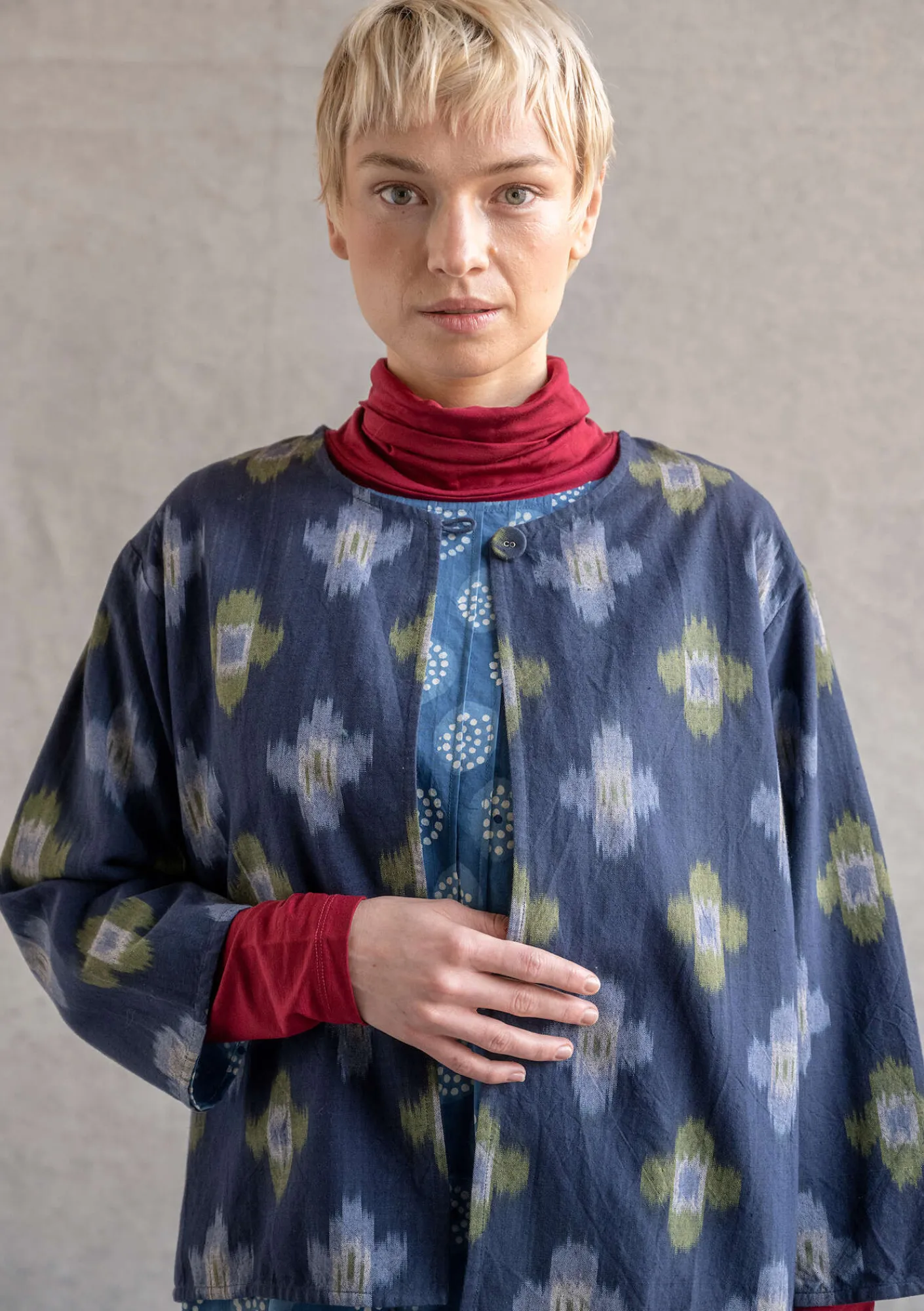 Ikatvävd jacka i en blommig mönstring. Lätt utställd modell med rund halsringning och trekvartslång ärm. Knäpps med en enkel tygklädd knapp.
