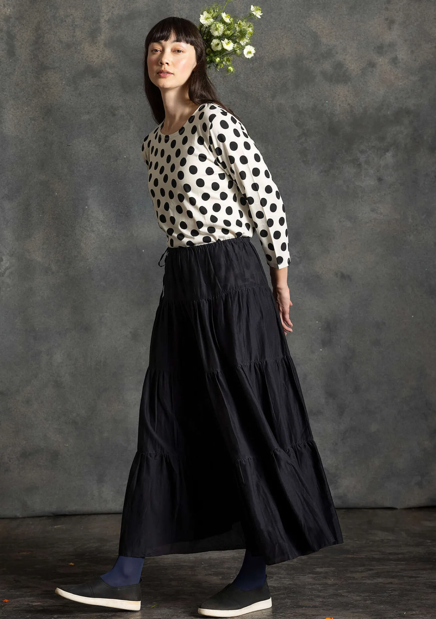 Kjol i härlig siden/bomullsväv med fint fall och mycket vidd. Fin modell sydd i fyra våder, dragsko samt bekväm resår i midjan.