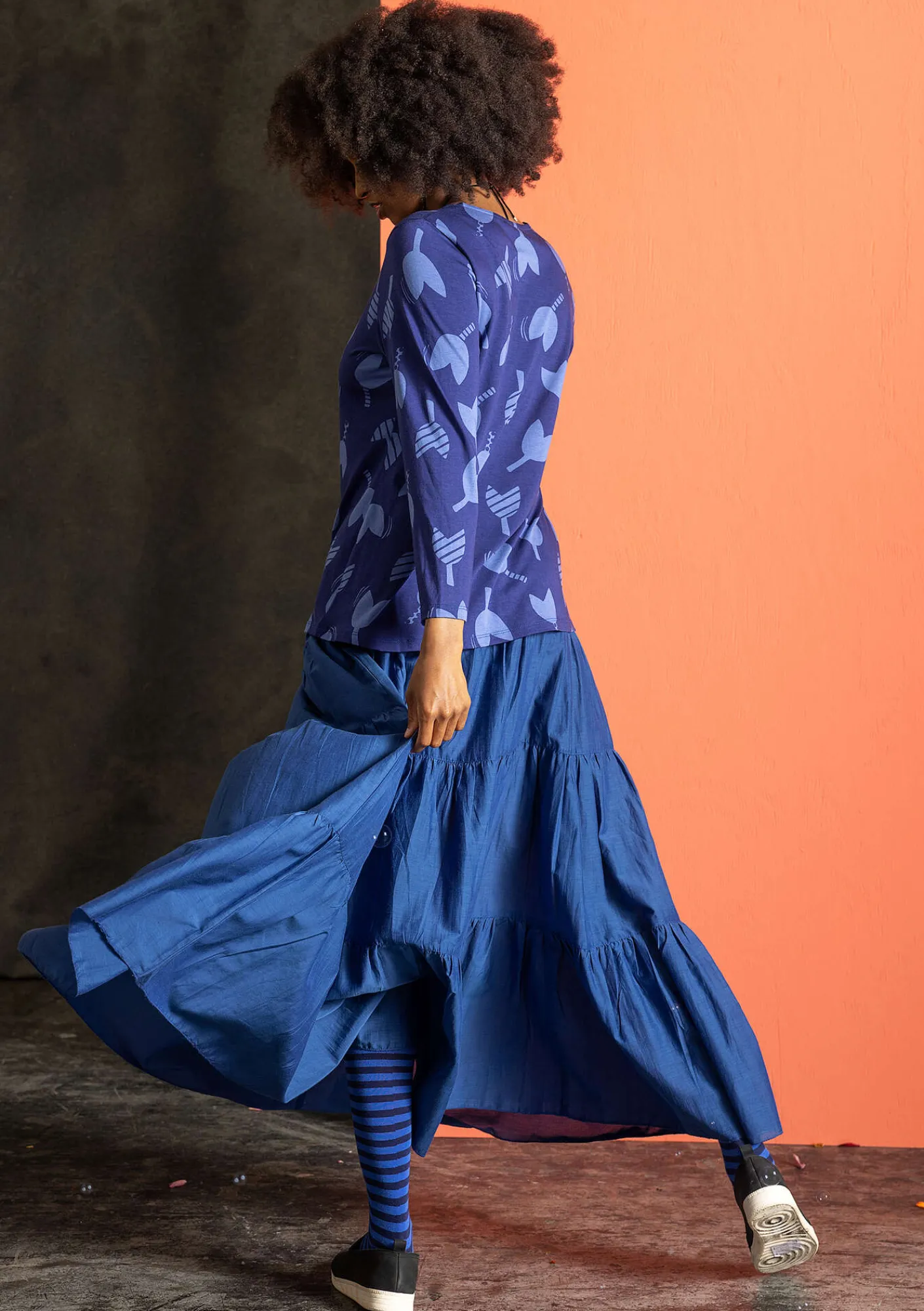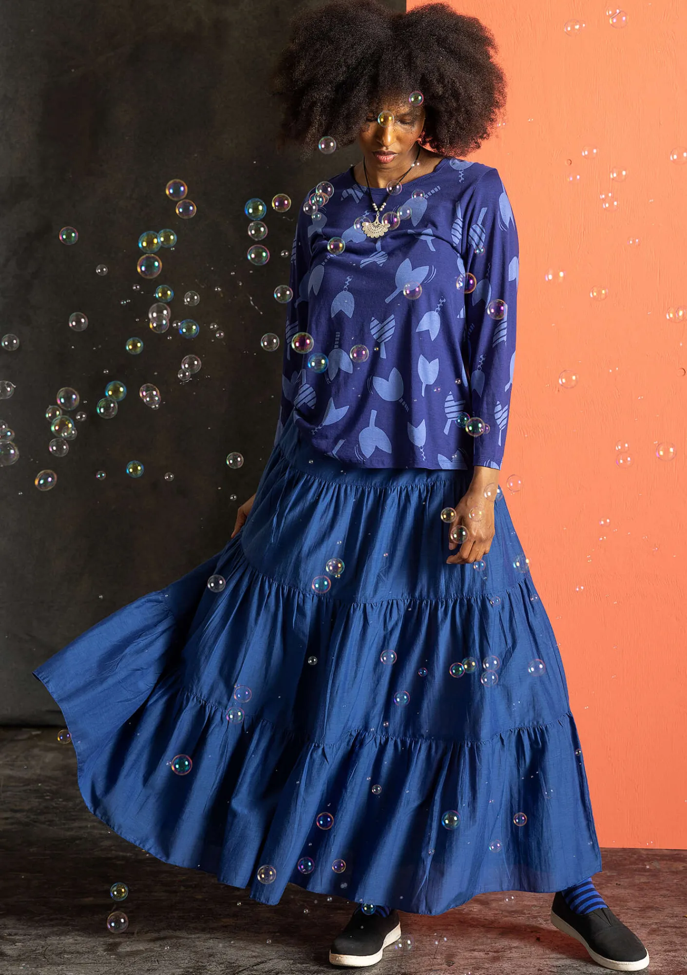 Kjol i härlig siden/bomullsväv med fint fall och mycket vidd. Fin modell sydd i fyra våder, dragsko samt bekväm resår i midjan.