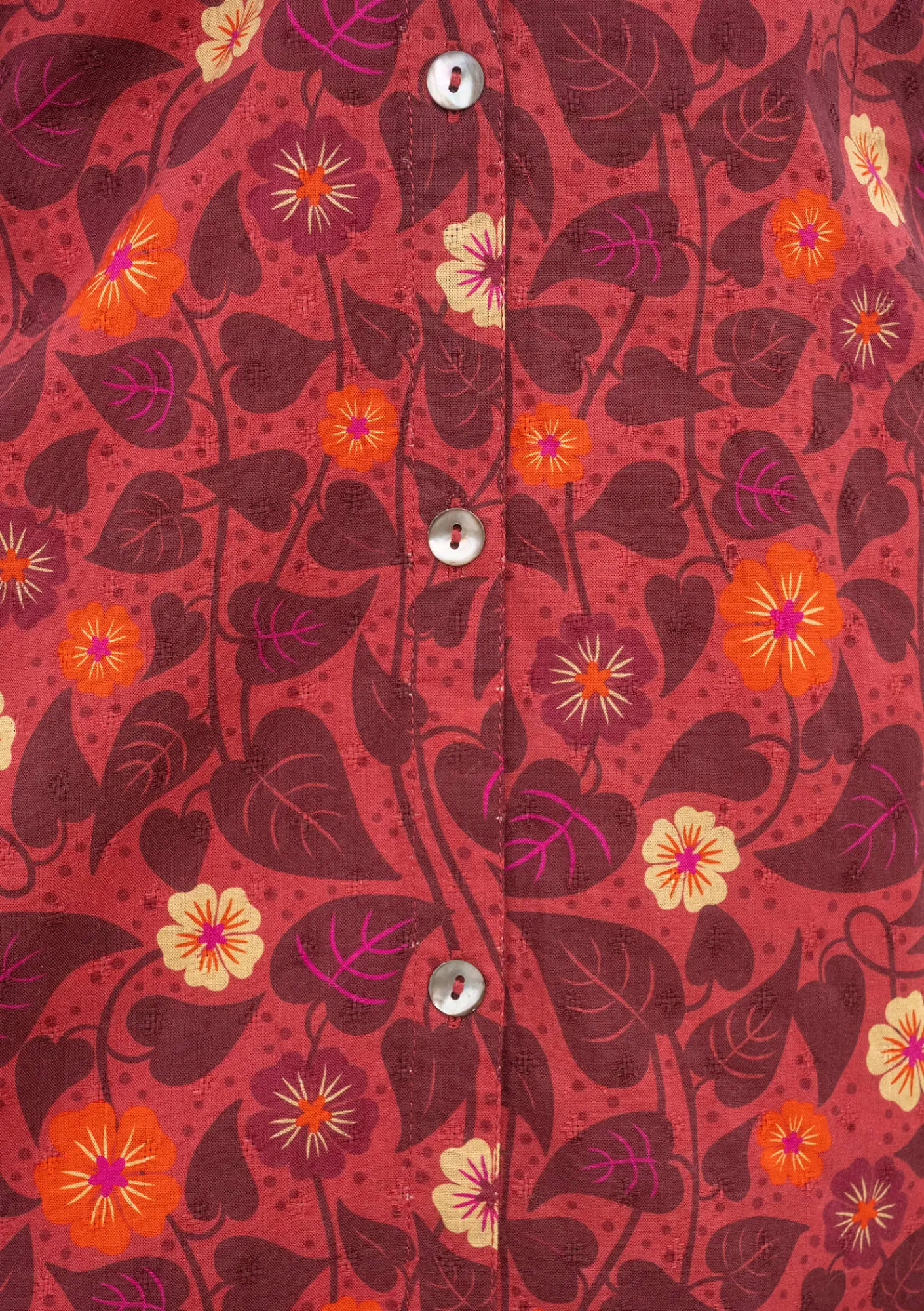 Digitaltryckt skjortklänning, sydd i en dobbyvävd kvalitet med lite struktur. Helt genomknäppt modell med en liten krage. Avskuren i midjan med rynkning baktill och i sidorna på framstycket. Knäpps med pärlemorknappar samt även en liten knapp vid ärmsluten.