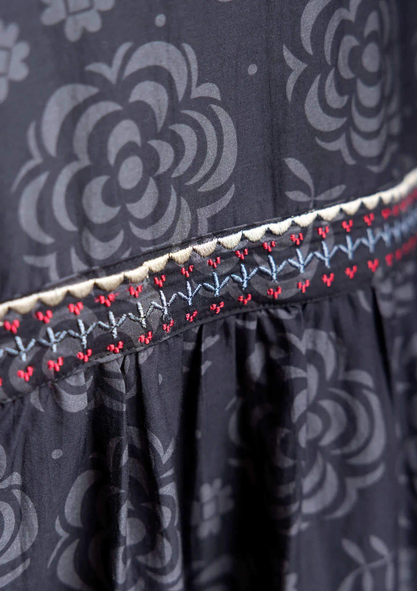 Digitaltryckt långklänning i en modell sydd i våder med rynkning. Broderat bystparti samt längs med våderna. Modell med fyrkantig halsringning och trekvartslång, något utställd, ärm med en infälld spets. Sidfickor samt en infälld ficka i midjesömmen med dekorativa broderier.