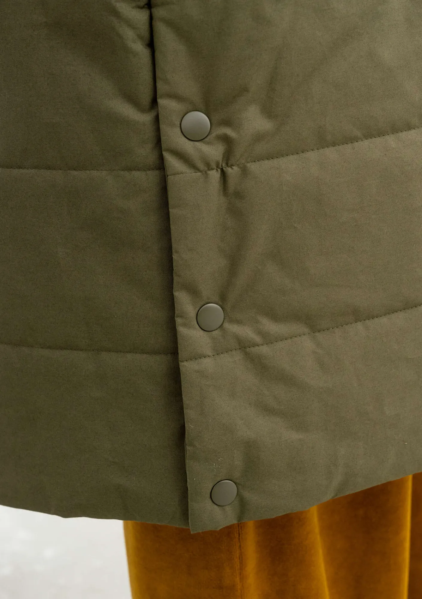 Kviltad, helfodrad kappa i en modell med hellång ärm och sidslitsar som kan knäppas igen med tryckknappar. Dold dragkedja samt en knappslå mitt fram. Rymliga fickor och en dold mudd i ärmen. Dekorativa broderier vid ärmslut, hals och runt huva.