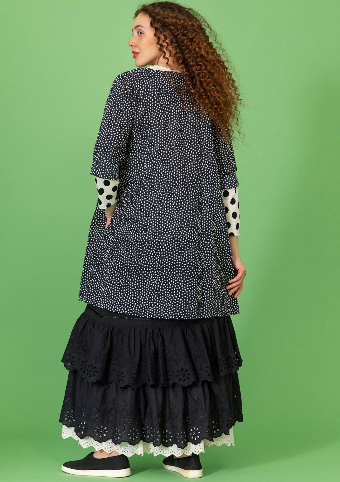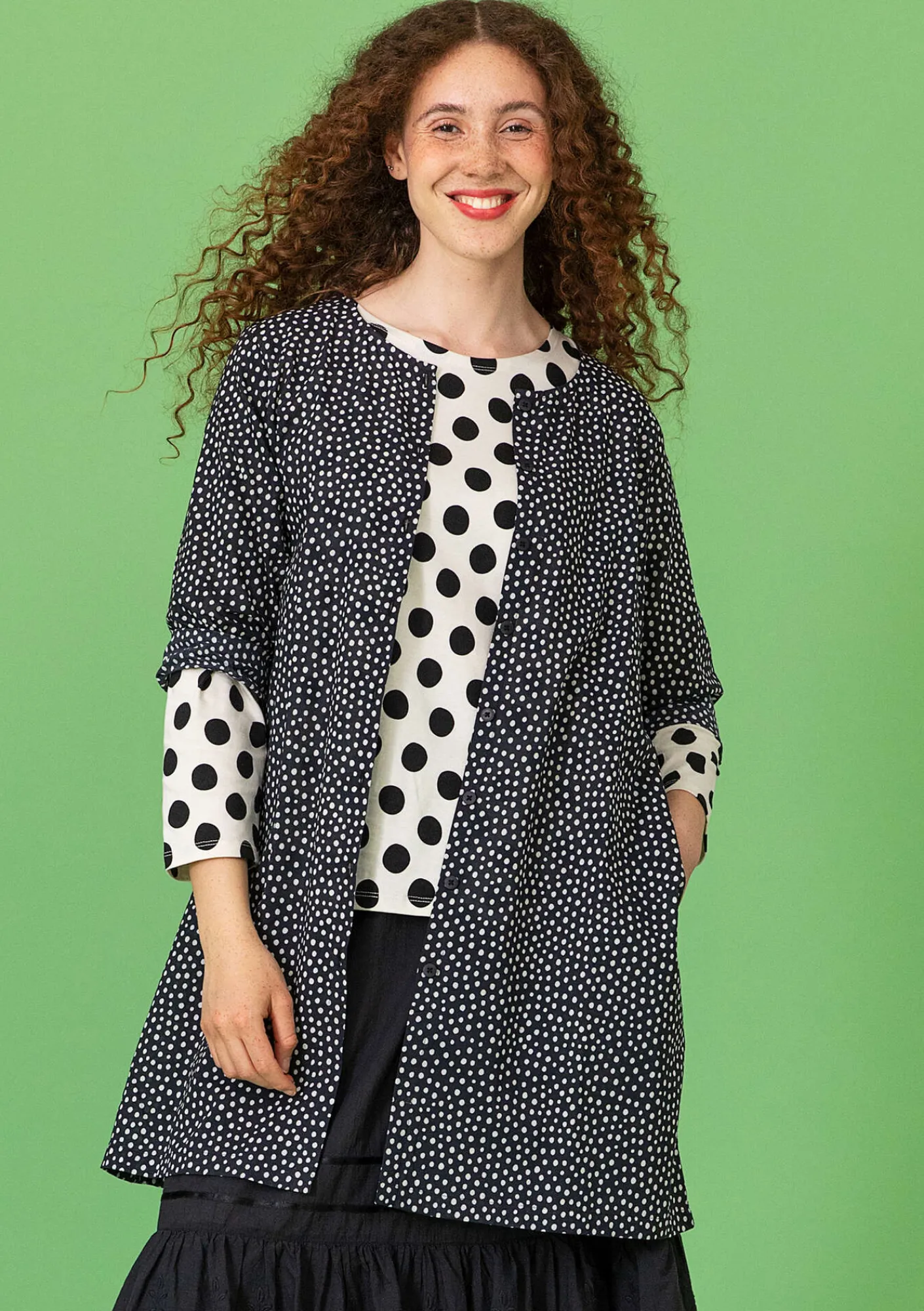 Genomknäppt tunika mönstrad med tryckta små prickar. Lättburen modell med rund halsringning och trekvartslång ärm. Dolda fickor i sidorna.