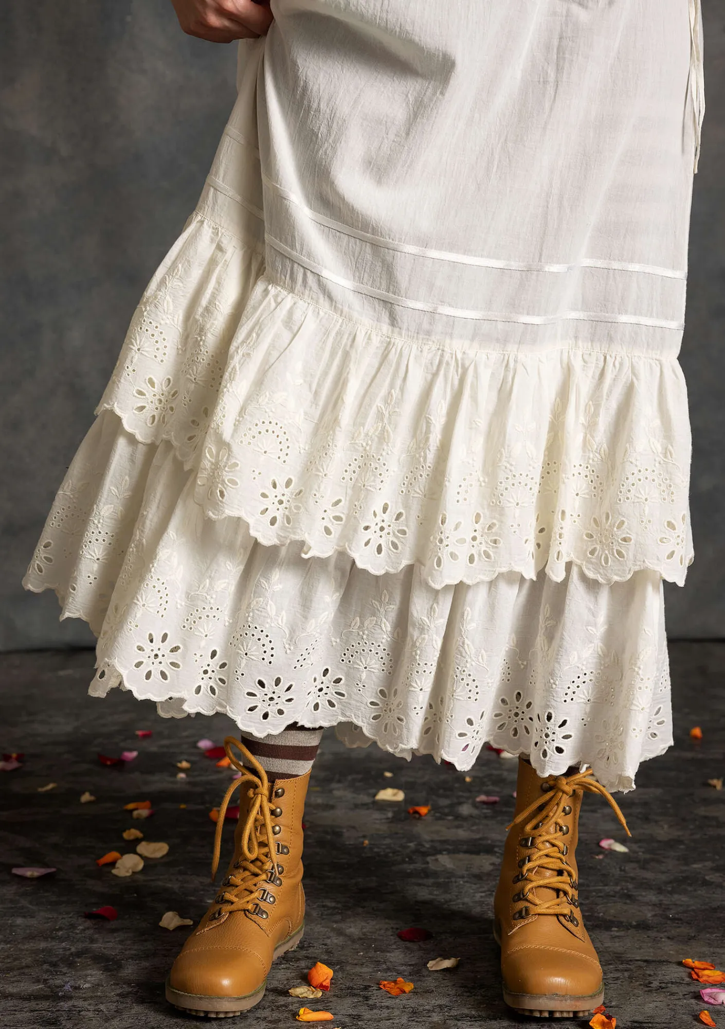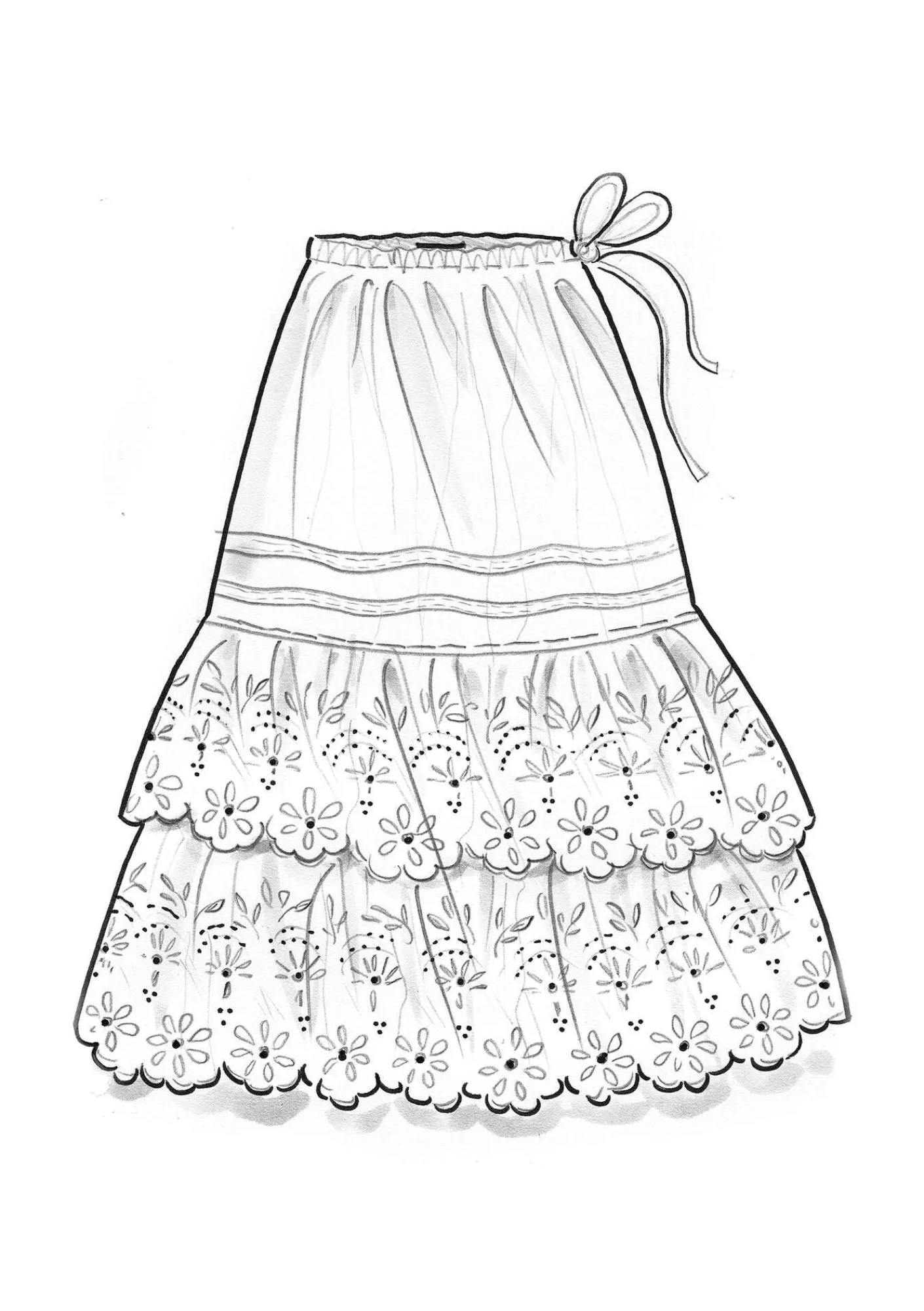 Utsmyckad kjol, fin att bäras som den är eller som en underkjol. Modell med två våder med hålbroderi som ligger i lager på varandra.Två rader av satinband sydda ovanför våderna. Resår i midjan samt dragsko.