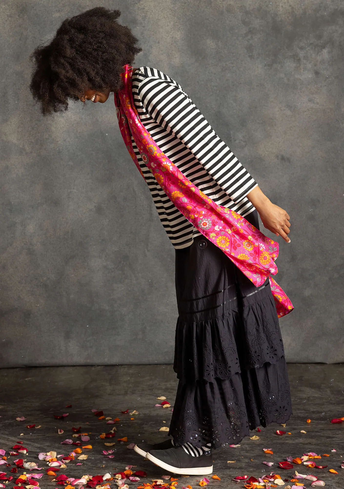 Utsmyckad kjol, fin att bäras som den är eller som en underkjol. Modell med två våder med hålbroderi som ligger i lager på varandra.Två rader av satinband sydda ovanför våderna. Resår i midjan samt dragsko.