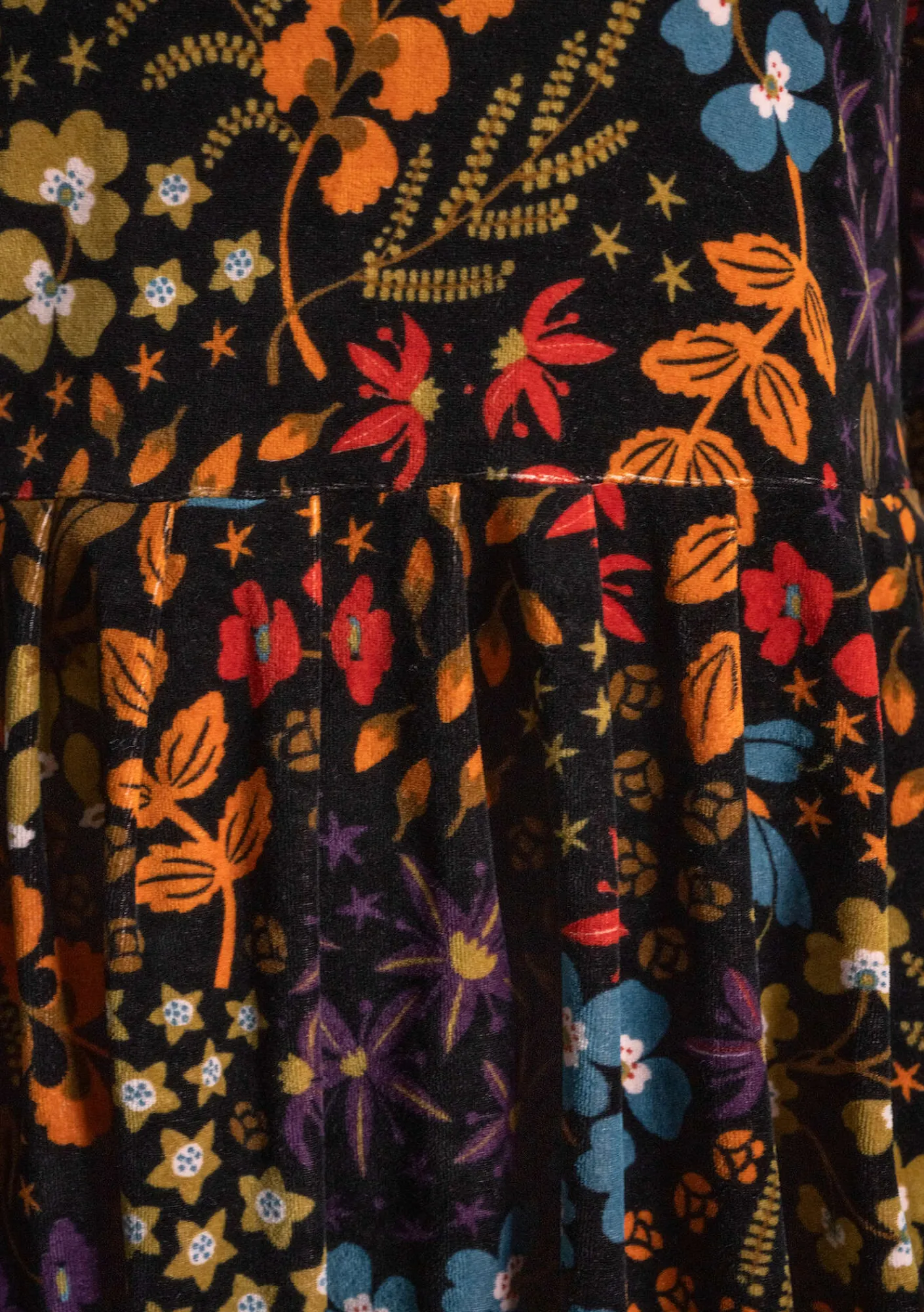 Tryckt velourklänning, avskuren i midjan med lagda veck i kjoldelen. Trekvartslång ärm med lite puff, sidfickor och rund halsringning med ett kort sprund framtill. Två färgställningar i tvåfärgstryck och en tredje mulifärgad med en dekorativ guldfärgad tråd som stickning i halsringningen.